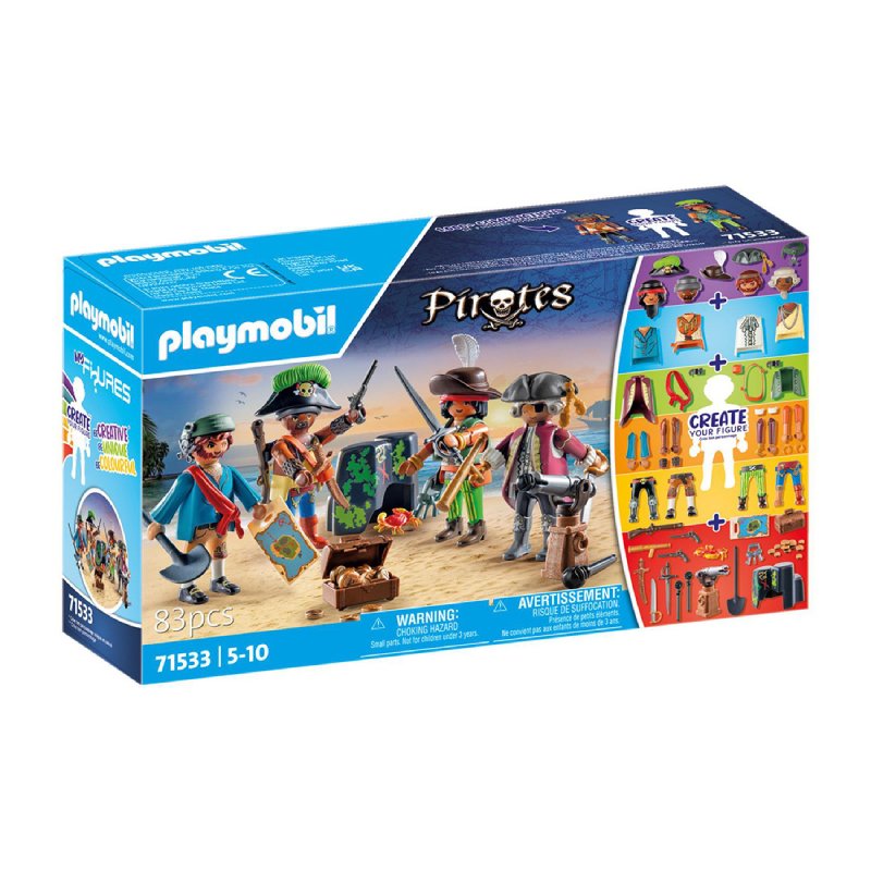 Playmobil My Figures: Πειρατές (71533). Περιλαμβάνει τέσσρις αποσυναρμολογημένες φιγούρες που μπορούν να συναρμολογηθούν ξανά και ξανά. Το περιστρεφόμενο κανόνι λειτουργεί. Το σεντούκι του θησαυρού μπορεί να κρυφτεί κάτω από τον μικρό βράχο.